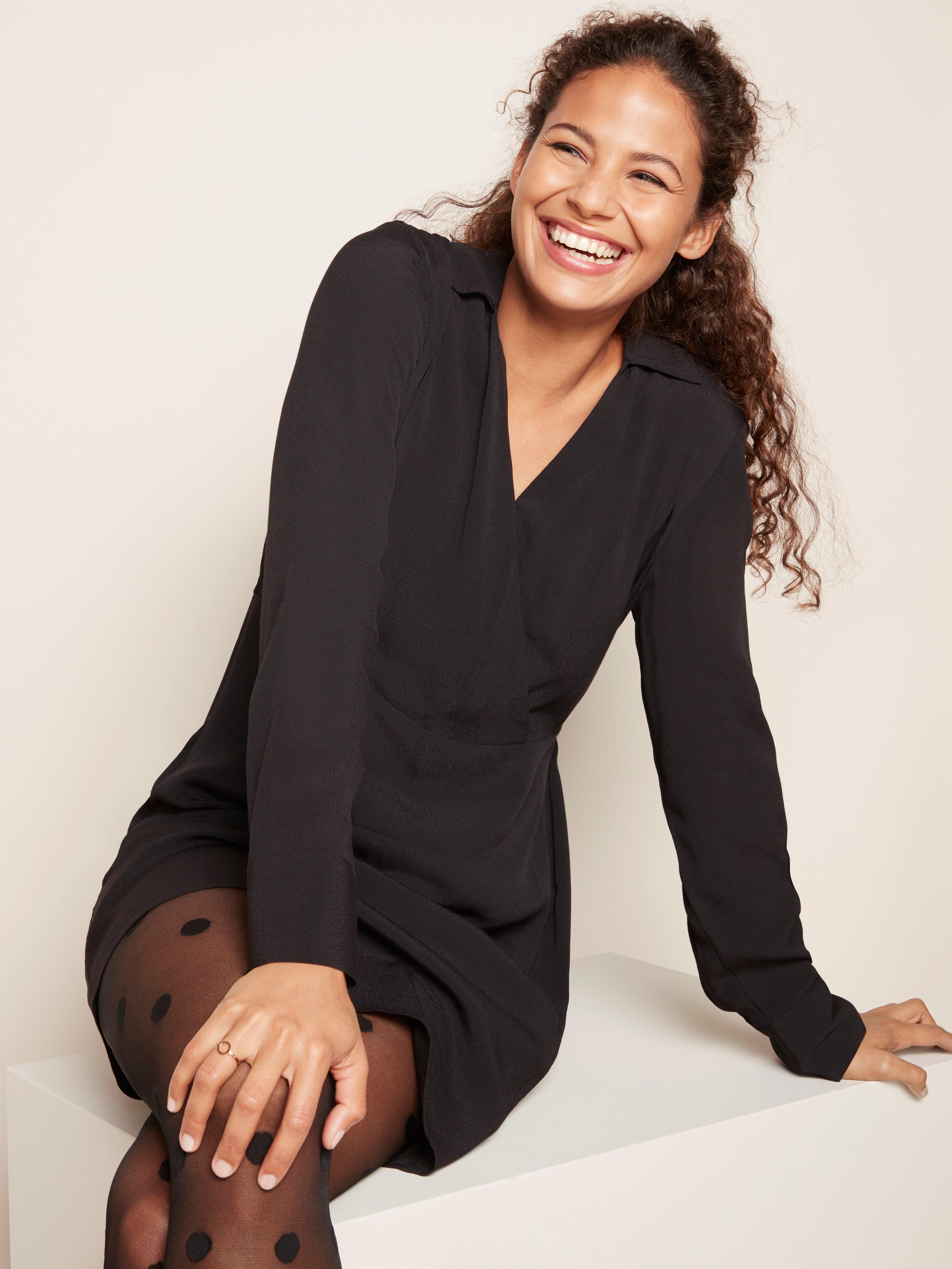 . Kjøp lang svart kjole Lyora er en lang svart kjole fra Naf Naf. Her finner du et stort utvalg langermede kjoler i en rekke stiler og modeller som passer til både hverdag og fest. Lukning i ryggen med åpning og knapp.